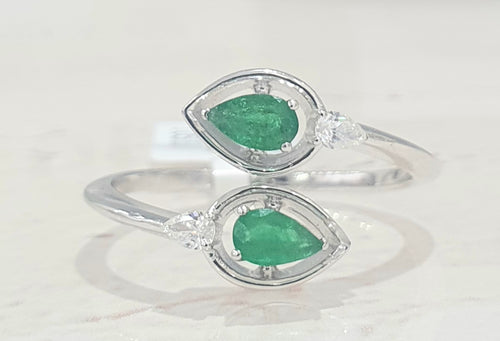 0.45cts [2] Pear Cut Emeralds | 0.10cts [2] Pear Cut Diamonds | Designer Open Shank Ring | 18kt White Gold