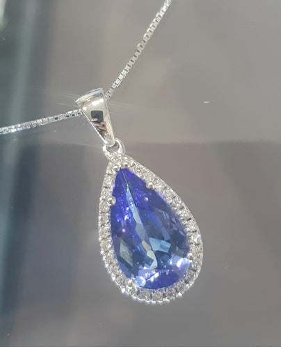 3.86ct Pear Cut Tanzanite | 0.20cts Round Brilliant Cut Diamonds | Designer Necklace | 18kt White Gold