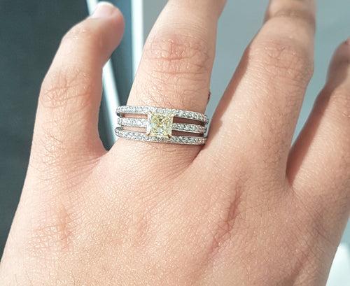 0.72ct Cushion Cut Fancy Yellow | 0.66ct Round Cut Diamonds | 3 Row Design | 18kt White Gold